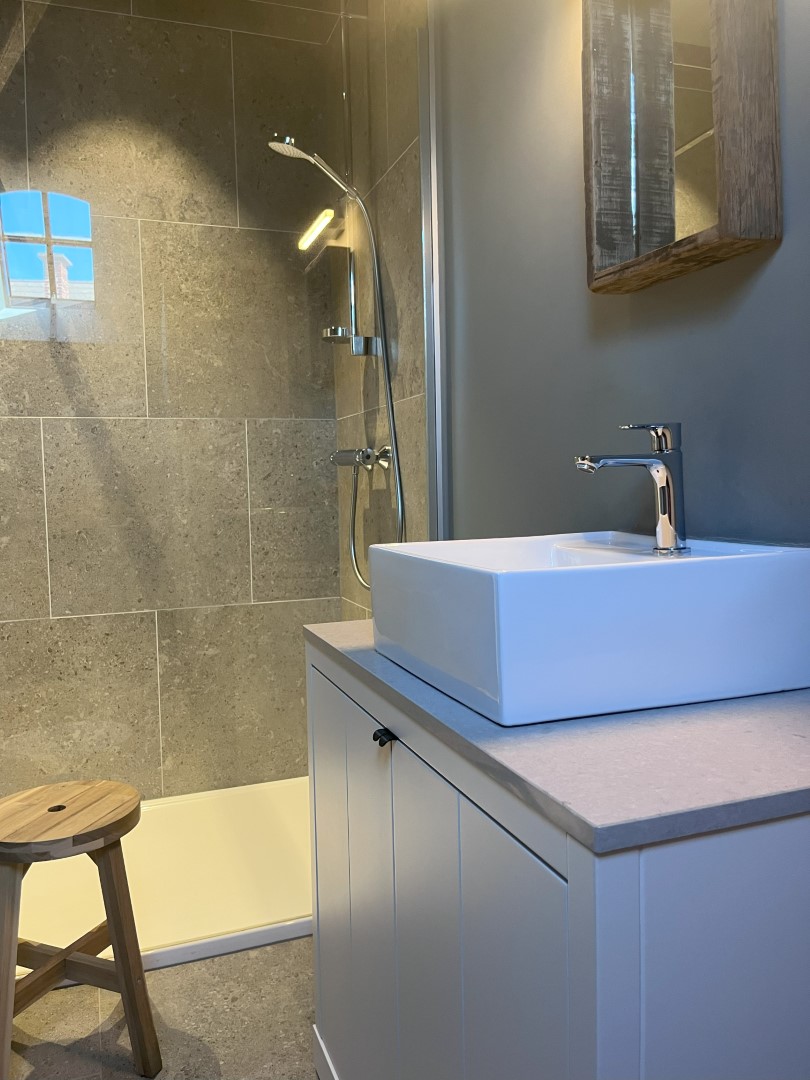 - Elke kamer heeft zijn eigen badkamer met lavabo en douche (één kamer heeft een ligbad i.p.v. een douche). 3 kamers beschikken over een eigen toilet in de badkamer. Zowel boven als beneden is er ook een gemeenschappelijk toilet in de gang.